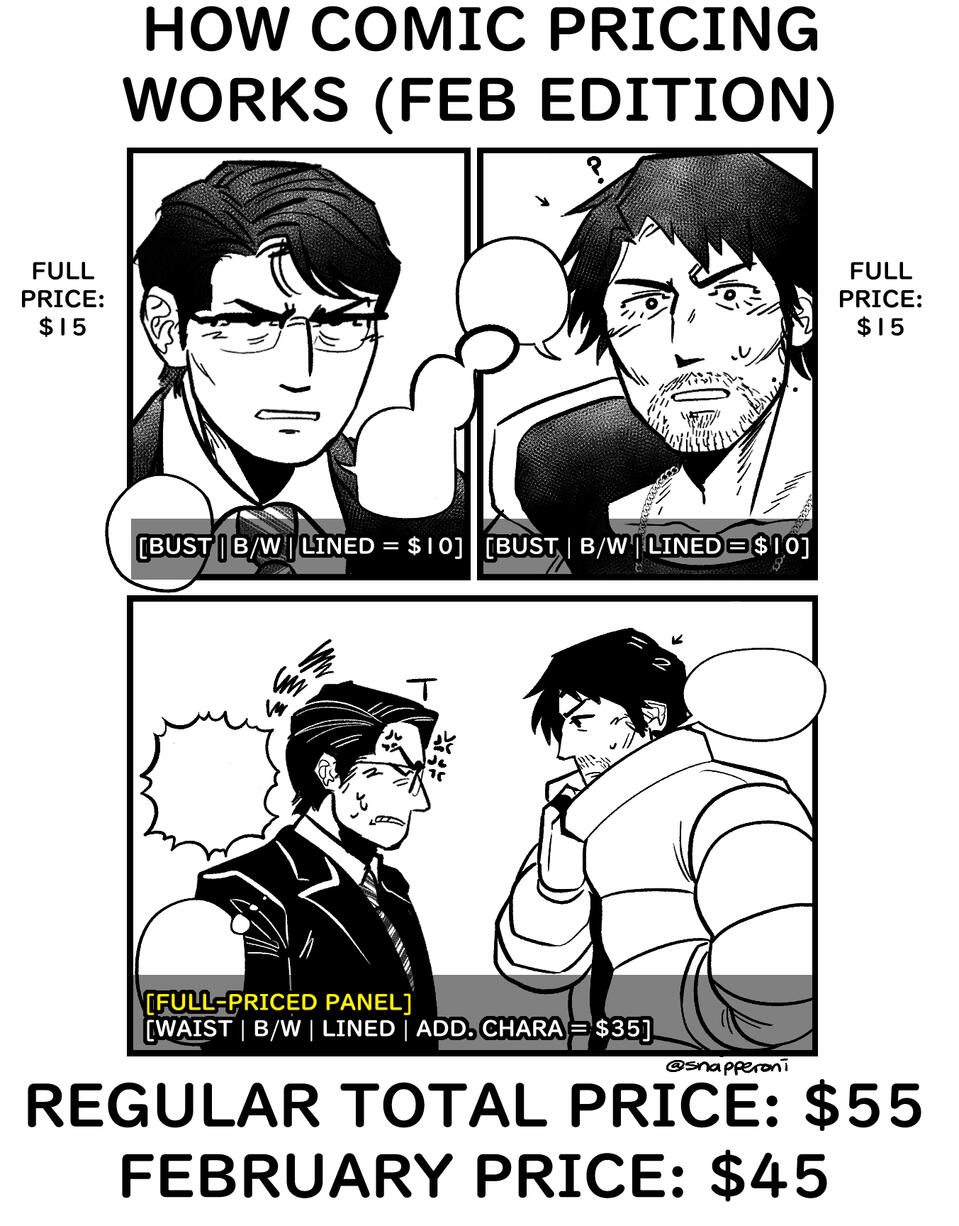 COMIC ORDERSComics can be ordered in any of the aforementioned styles (sketch, clean lines, rendered) and there's NO LIMIT to how many PAGES NOR PANELS you can order.When ordering a comic, I WILL WORK WITH YOU BEFORE PAYMENT to sketch out a ROUGH DRAFT (free of charge!) of your comic so we can work together to figure out how much the final comic will cost.THE MOST EXPENSIVE PANEL will be at FULL PRICE, however EVERY OTHER PANEL will be treated with ADDITIONAL CHARACTER PRICES.