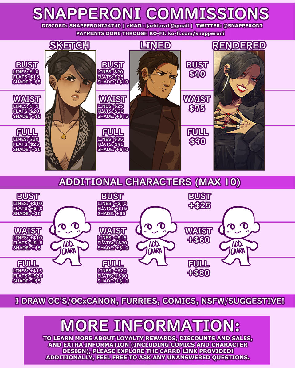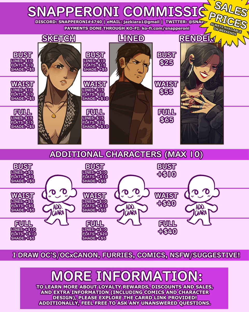 ALONGSIDE HOLIDAY SALES, YOU CAN GET A DISCOUNTED COMMISSION THREE OUT OF THE SEVEN DAYS OF THE WEEK!I prioritize providing my clients commissions they adore in a timely manner; I hardly like to wait for things myself, and so I wouldn't like to keep others waiting terribly long either.As a result, when you order a commission anytime on SATURDAY, SUNDAY, OR AFTER 5PM (EST) ON FRIDAYS, you are provided a DISCOUNTED PRICE in exchange for having to wait a little longer for me to start the commission.Whenever there is a holiday sale, I'll always announce it on my Twitter and Tumblr (@todayisafridaynight), so no worries about having to guess when a holiday sale might come around.Lastly, I also do END-OF-THE-MONTH SALES when there's just A WEEK LEFT IN THE MONTH, everything will be on sale until 12AM (EST) on the second day of the new month!RETURNING BUYER REWARDSI keep track of any and all persons that order something from me, and I'm always warmed to see people come back to order from me again. As a thank you for trusting and supporting me as well as for enjoying my artwork, for EVERY THREE $30+ PURCHASES you make I'll offer a FREE DRAWING!In order to redeem this free drawing, the three commissions must have been ordered within one month of each other.